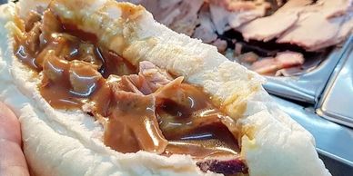 Custom made 10 inch torpedo rolls with your choice of a selection of all 3 meats (Pork, Beef Brisket, Marinated Grilled Chicken). This includes gravy, creamy mushroom sauce and apple sauce, aswell as crackle for the pork lovers.